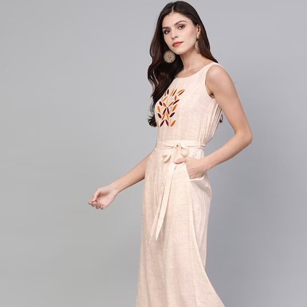 Off-white and beige printed basic jumpsuit with Embroidered detail, has a round neck, sleeveless, two pockets